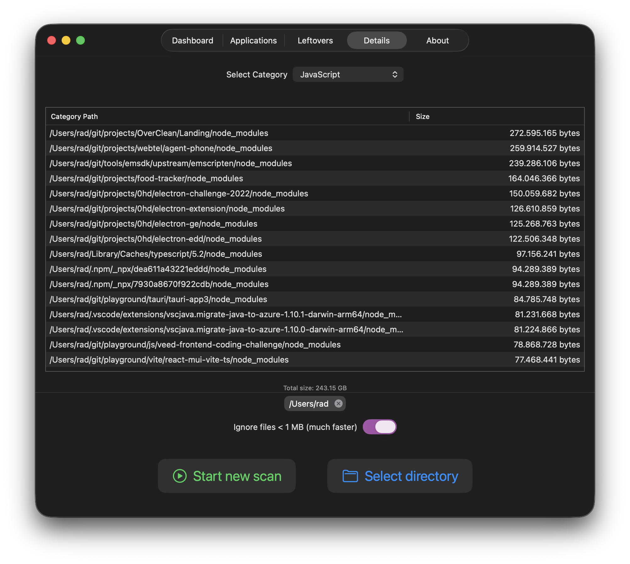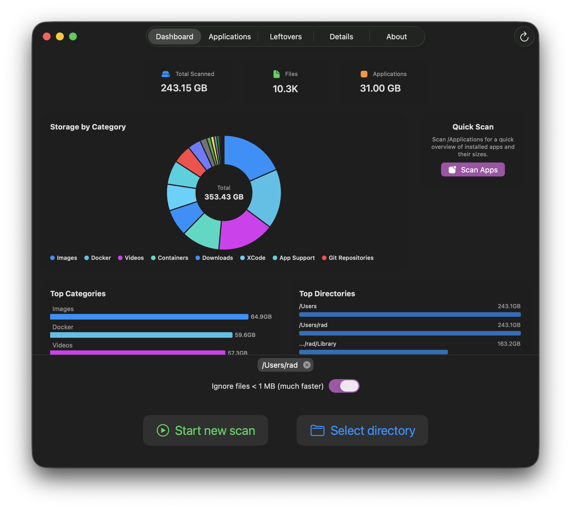 A native macOS disk space analyzer that scans your directories, categorizes files by type, and helps you identify what's consuming your disk space.